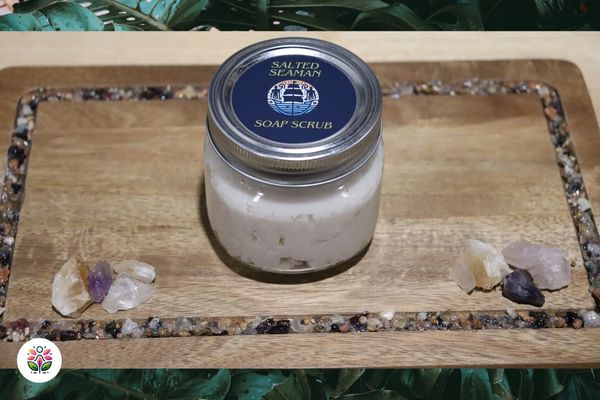 8 oz. glass jar filled with our light salt soap scrub designed for your whole body.